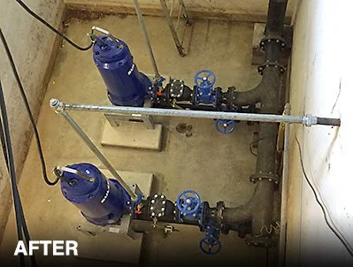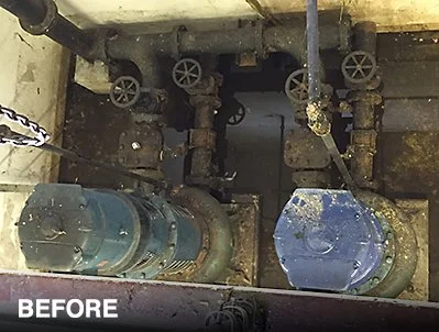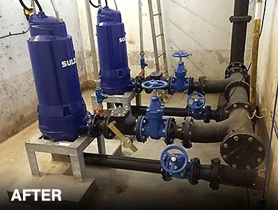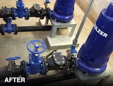 We were called out to remove the existing close coupled pumps, replace the suction and delivery pipework including replacement of non-return and isolation valves, and to install two high efficiency, dry well pumps.